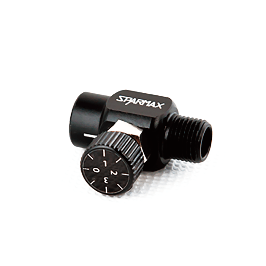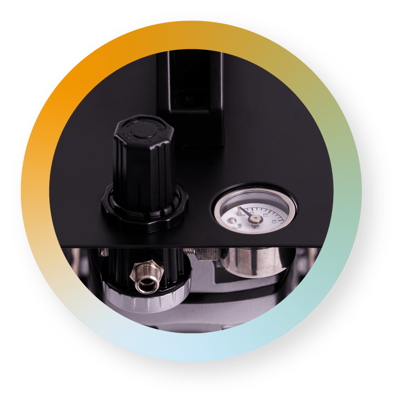 圧力ゲージつきのエアーレギュレーター。指示針の位置を確認しながら細かく圧力調整ができます。